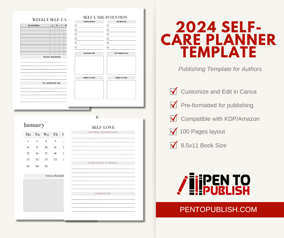 Create and publish a 2024 self-care planner with this pre-designed and ready to publish canva template from Pen to Publish.