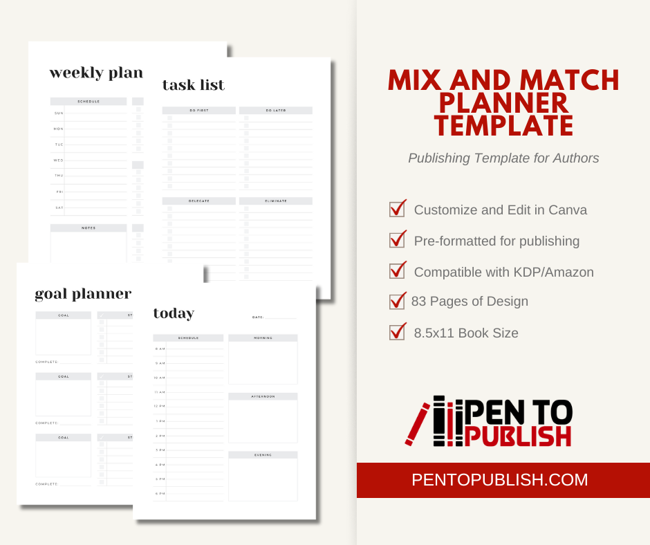 Create and publish an undated planner with this pre-designed and ready-to-publish mix and match canva template from Pen to Publish.