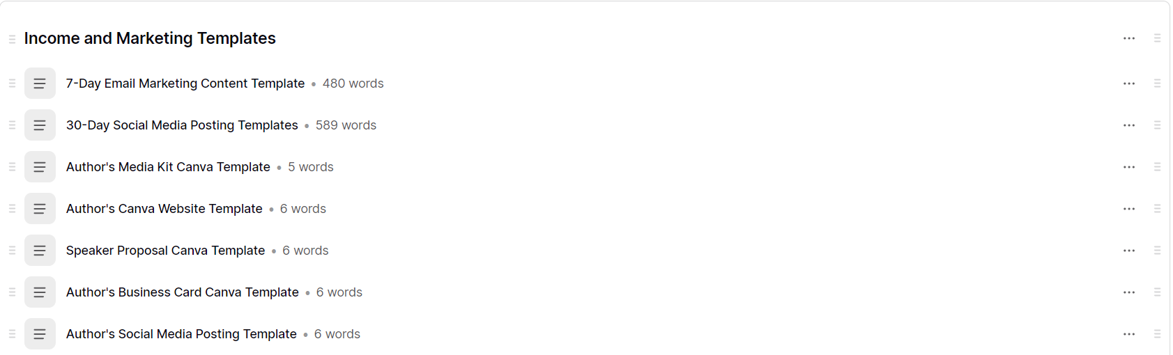 This toolkit is comprehensive and includes 20+ income and marketing resources. These resources include video training, 30-day plans, and templates, all designed to help you increase book sales and GET PAID!